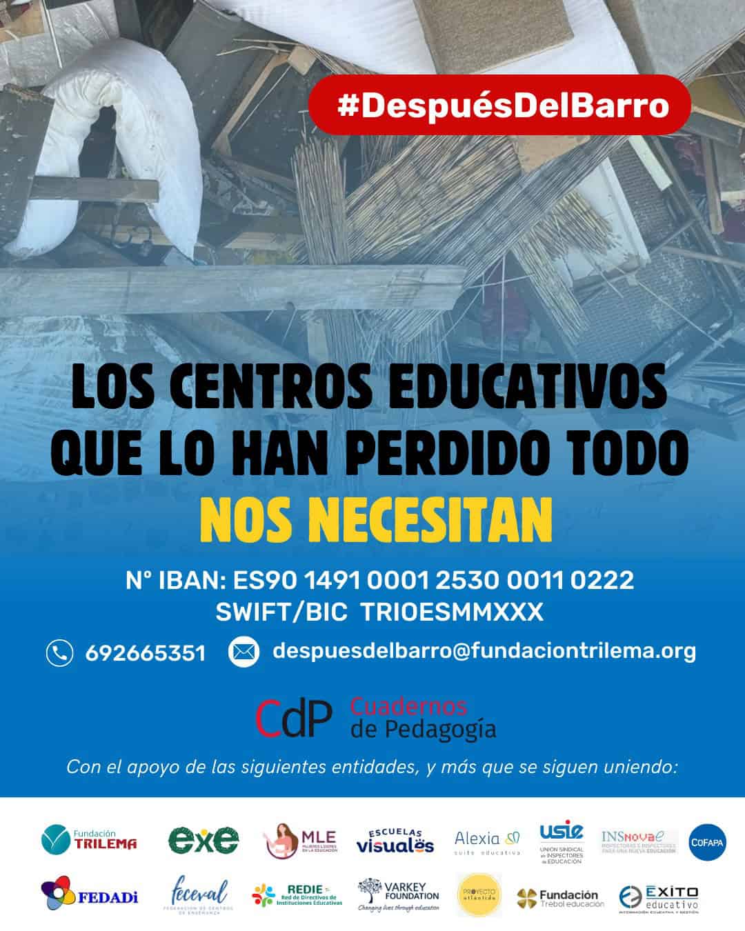 “Necesitamos vuestro apoyo. Por eso, como directora de Cuadernos de Pedagogía y valenciana, lanzo una petición de ayuda, tanto económica como de material, a través de una iniciativa que hemos llamado #DespuésDelBarro. Durante estos días, estamos volcados limpiando y llevando comida y agua a las familias, pero lo próximo es llenar los centros educativos y escuelas infantiles que lo han perdido todo.