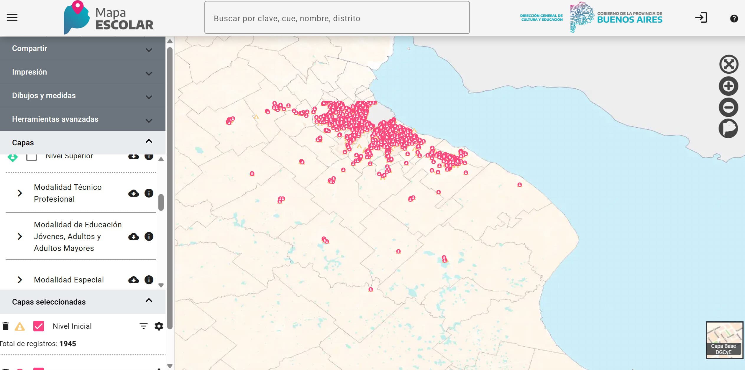 - Configuración de capas avanzada: Una de las funcionalidades más potentes es la capacidad de aplicar filtros por distrito o región educativa. Además, es posible integrar datos externos mediante servicios WMS (Web Map Service). Esto amplía notablemente las posibilidades de análisis espacial para quienes trabajan con información territorial, permitiendo superponer diferentes conjuntos de datos para una comprensión más profunda. Entre las capas que se pueden visualizar se encuentran:
