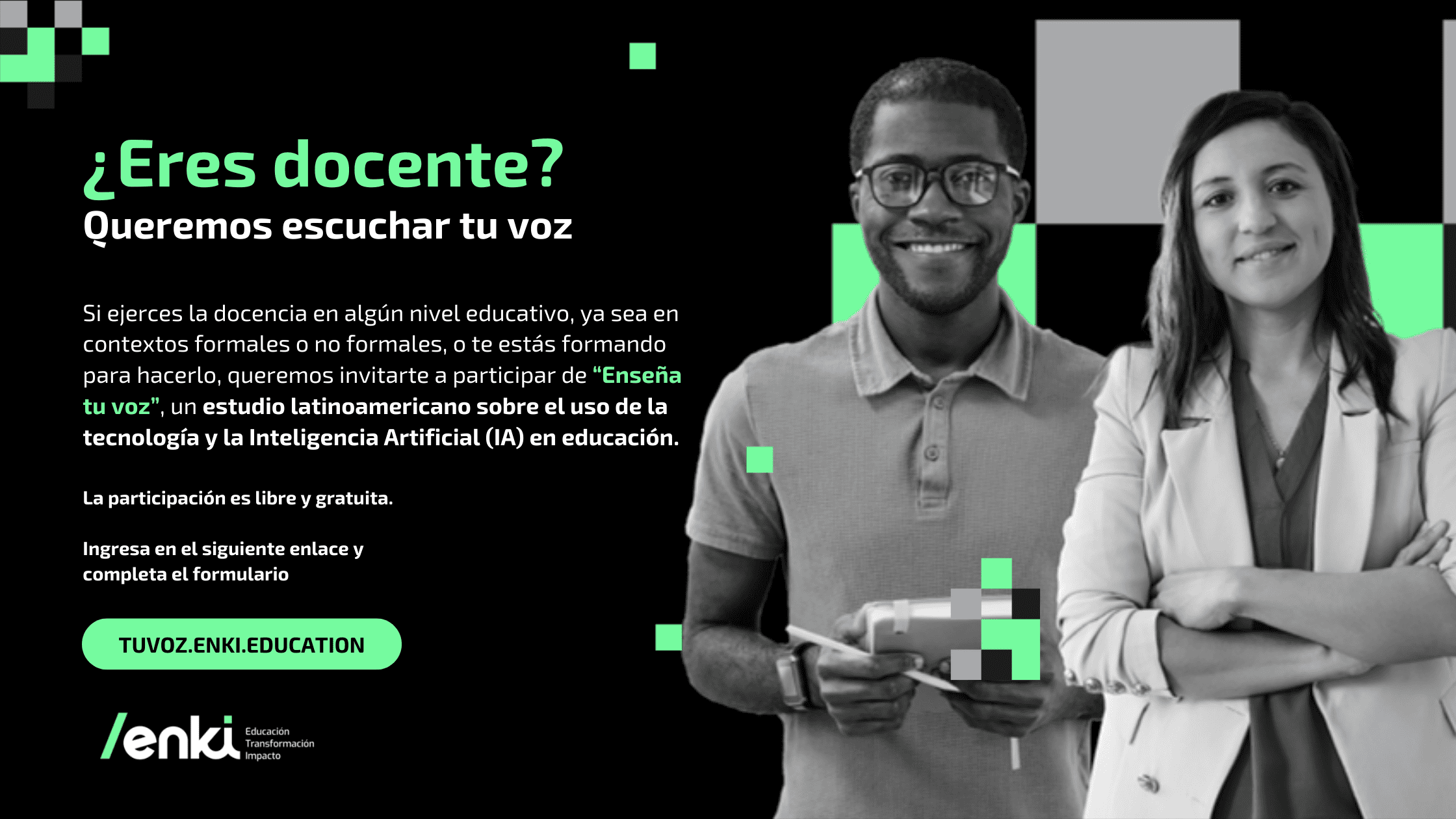 Enki lanzó “Enseña tu voz”, una campaña dirigida a docentes en ejercicio y en formación de todos los países de América Latina. Se trata de una campaña digital, libre y gratuita que busca profundizar en los desafíos y oportunidades a la hora incorporar tecnología en la enseñanza, sobre todo en lo que refiere al uso de herramientas de Inteligencia Artificial generativa en las prácticas de los docentes. El formulario estará disponible del 13 de noviembre al 12 de diciembre de 2023.